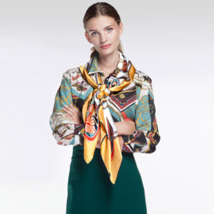 - Z garniturem – damski garnitur, czyli komplet składający się z dopasowanych spodni i eleganckiej, dobrze skrojonej marynarki, to popularny strój współczesnej bizneswoman. Warto go ożywić apaszką z subtelnym kolorowym motywem, zawiązaną na luźny supełek wokół szyi. W ten prosty sposób do eleganckiego, wybieranego na formalne okazje ubioru wprowadzimy odrobinę lekkości i subtelności, która jeszcze bardziej podkreśli kobiecy styl. Chcąc uzyskać stylizację pełną harmonii, warto zwrócić uwagę na to, by apaszka świetnie komponowała się z kolorystyką torebki i obuwia i była utrzymana w stonowanej kolorystyce.