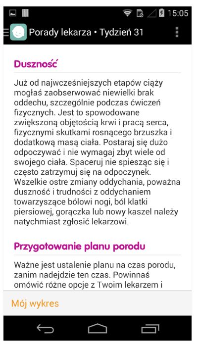 - badania – rozpisane badania na każdy tydzień ciąży, z funkcją przypominania, kiedy należy je wykonać