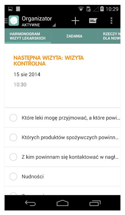 - kalendarz wizyt lekarskich, w którym można ustawić przypomnienie, pytania do lekarza, uwagi do przejrzenia po wizycie