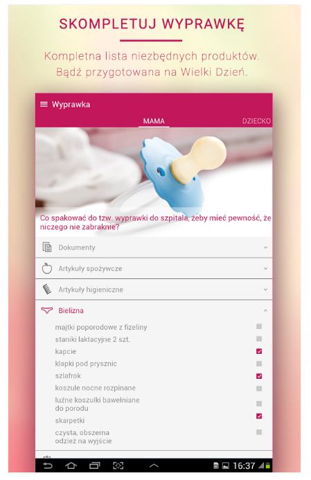 - lista rzeczy do szpitala – dla mamy, dla dziecka, dokumenty